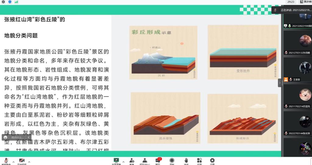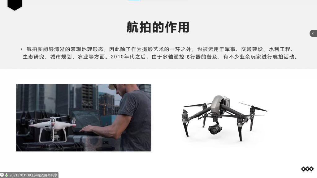 本次活动采用网络直播的方式展开活动,首先由地理爱好者协会天文部部长米国昊同学,开展对地理爱好者协会的介绍,并向五湖四海的同学展示并介绍了复杂多样的甘肃省的地理环境,从汉武大帝时的“张国臂掖,以通西域”,到新时代甘肃省在丝绸之路经济带的再次腾飞,甘肃地理环境的变迁让同学们对有着浓厚历史地理古韵的甘肃有了新的认识。尤其到介绍徐霞客笔下“有山千丈色如丹,三叠风光一径盘”的张掖丹霞地貌,更是激发了同学们强烈探索的热情。而后,由无人机协会航测部部长王兴榣从三个方面为大家进行讲解。他首先以生动的例子和精美的图片完美地阐释了航拍的定义;其次又分别介绍了航拍在生产生活、文艺修复、抗震救灾等各个方面的重大用途;再次讲解了航拍技术在航空摄影测量方面的广泛运用和发展前景;最后,向全体人员展示了航拍的照片和视频。航拍只是无人机的特色之一,无人机会协会遨游天空的梦想更是引发了同学们的激烈讨论。在活动最后的提问互动环节,各部门部长热情地为同学们的疑惑一一进行了解答。