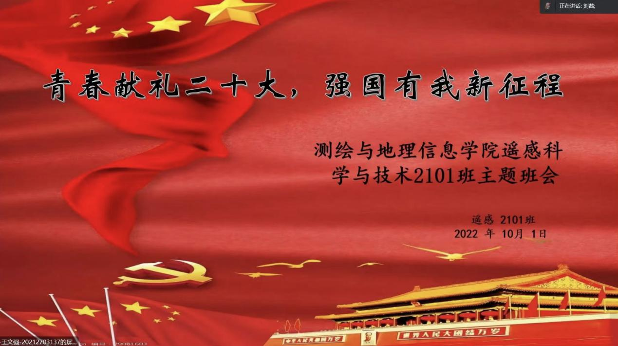 在党的二十大、中华人民共和国成立73周年的重要历史节点,进一步加强大学生爱国主义教育,培养学生热爱祖国情怀,引导学生做有理想、有追求、有担当、有作为、有品质、有修养的大学生。对于谱写新时代中国青年运动新篇章、实现中华民族伟大复兴,具有重要的现实意义与时代价值。2022年9月30日、10月1日两日期间测绘与地理信息学院各班级举行了“青春献礼二十大,强国有我新征程”的主题班会,班会期间各班班主任和同学们以线上形式展开分享与交流。