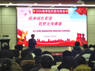 为贯彻落实国务院、中央军委“一年两征”的决策部署,扎实推进学院2026年春季大学生征兵工作,全面普及征兵政策,激发青年学生入伍热情,12月25日,我院联合化工学院、新能源学院、生物学院举办2026年春季征兵政策解读暨退役大学生事迹宣讲会,会议由化工学院学工办主任李刚主持,新能源学院、化工学院、测地学院、生物学院等四个学院240多名学生代表参加。