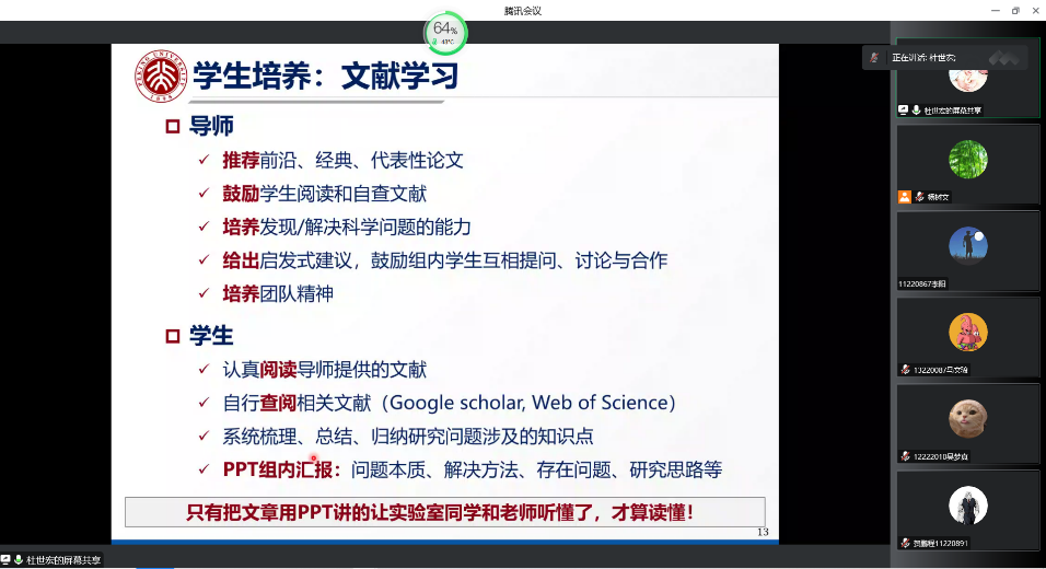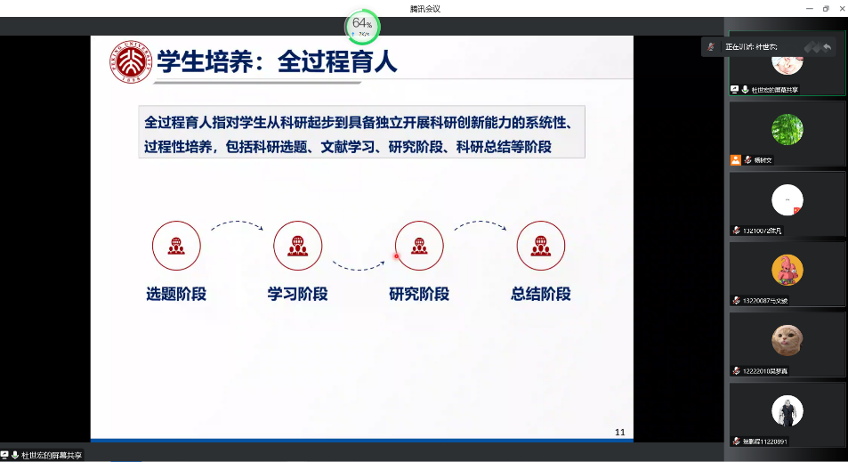 接下来,杜教授从科研选题、文献学习、研究阶段和科研总结四个方面详细讲述了如何从老师的角度培养学生独立思考、凝炼科学问题的能力以及从学生的角度举例探讨了如何配合老师培养科研意识和独立从事科研的能力。
