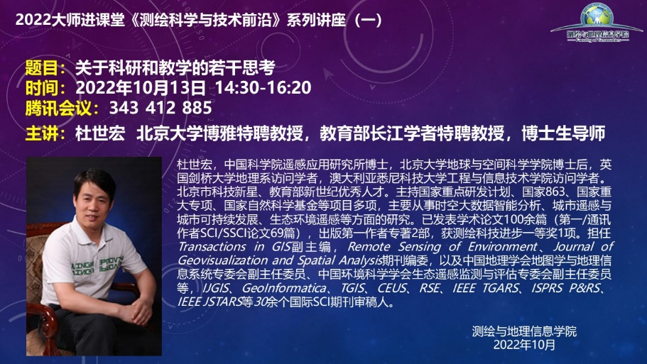 2022年10月13日下午14:30-16:20,应学院邀请,国家级特聘教授、北京大学博雅特聘杜世宏博士在线为我院2022级研究生新生讲授第一讲《测绘科学与技术导论》课程,这是我院大师进课堂系列讲座之一。本次授课的主题是:“关于科研和教学的若干思考”,学院部分老师和研究生共120余人参加了在线学习和交流。讲座由杨树文教授主持。