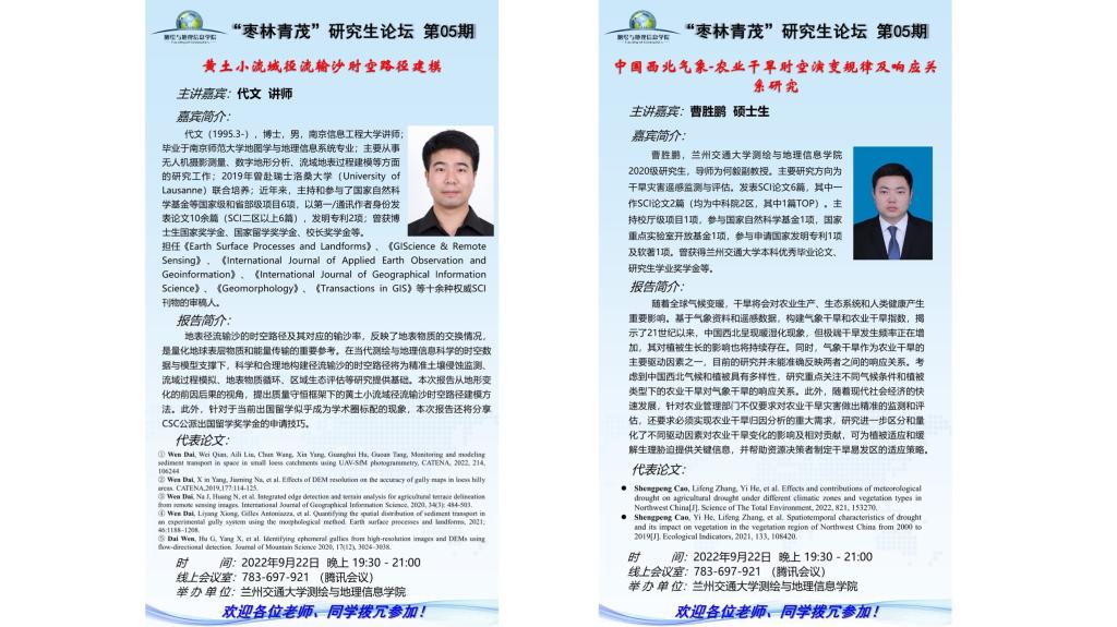 9月22日晚上19:30,学院在线上成功举办了第5期“枣林青茂”研究生论坛。论坛邀请了南京信息工程大学的博士研究生代文和我院硕士研究生曹胜鹏,分别汇报了各自的科学研究工作和科研心得体会。学院部分老师和在读硕士、博士研究生共70余人参加了此次的线上论坛,我院张黎明和高鸿两位老师共同主持了本期论坛。