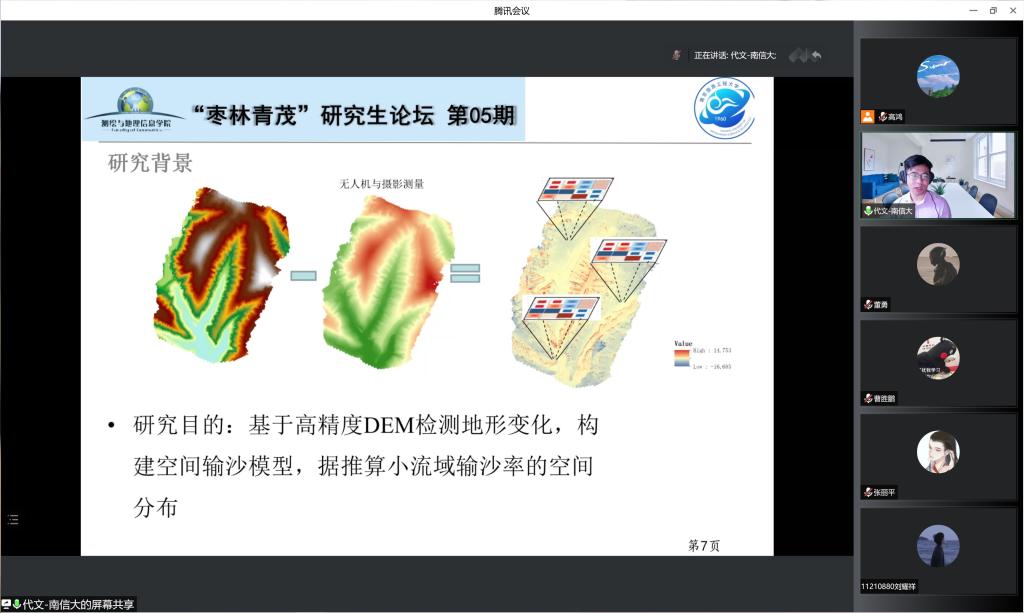 代文博士作了题为《黄土小流域径流输沙时空路径建模》的学术汇报。报告首先从方法上介绍了如何根据无人机的摄影测量数据,构建高精度的数字高程模型,重点阐述了控制点数量、航高等因素对地形建模的影响。然后,利用高精度的数字地形进行地形变化检测,在此过程中创新性地考虑了误差的空间自相关,通过模拟误差的空间分布,提高了地形变化检测结果的敏感性。最后,根据检测出的地形变化,研究了泥沙的空间传输,构建出了小流域的空间输沙模型,说明了泥沙搬运的时空路径,取得了一系列的研究成果。除此之外,代博士结合自身经历,向同学们介绍了申请出国留学的一些途径、经验与方法。汇报引起了参会人员的充分关注和讨论,取得了较好的反响与效果。