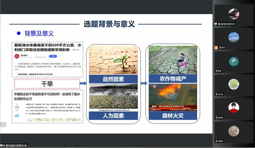 曹胜鹏同学是我院2020级在读硕士研究生,至今已发表多篇高水平SCI论文。本次论坛作了题为《中国西北气象-农业干旱时空演变规律及响应关系研究》。报告基于气象资料和遥感数据,构建气象干旱和农业干旱指数,并通过多种数据分析方法,揭示了21世纪以来中国西北呈现暖湿化现象。此外,考虑到中国西北气候和植被具有多样性,报告讨论了不同气候条件和植被类型下的农业干旱对气象干旱的响应关系。针对农业管理部门不仅要求对农业干旱灾害做出精准的监测和评估,还要求必须实现农业干旱归因分析的重大需求,报告进一步区分和量化了不同驱动因素对农业干旱变化的影响及相对贡献,可为植被适应和缓解生理胁迫提供关键信息,并辅助制定适应策略。