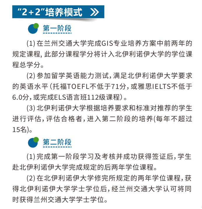 项目简介:兰州交通大学与北伊利诺伊大学“2+2”联合培养项目面向地理信息科学专业学生,由测绘与地理信息学院作为办学主体,美国北伊利诺伊大学作为国外合作高校。该项目采取“2+2”培养模式,即国内学习2年,国外学习2年的模式,完成规定学业的学生将同时获得兰州交通大学学士学位和北伊利诺伊大学的学士学位。